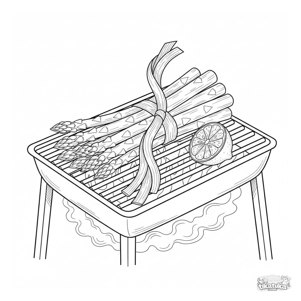 Página para colorear para niños mayores 10-12 años: un manojo realista de espárragos con limón en una parrilla de jardín.