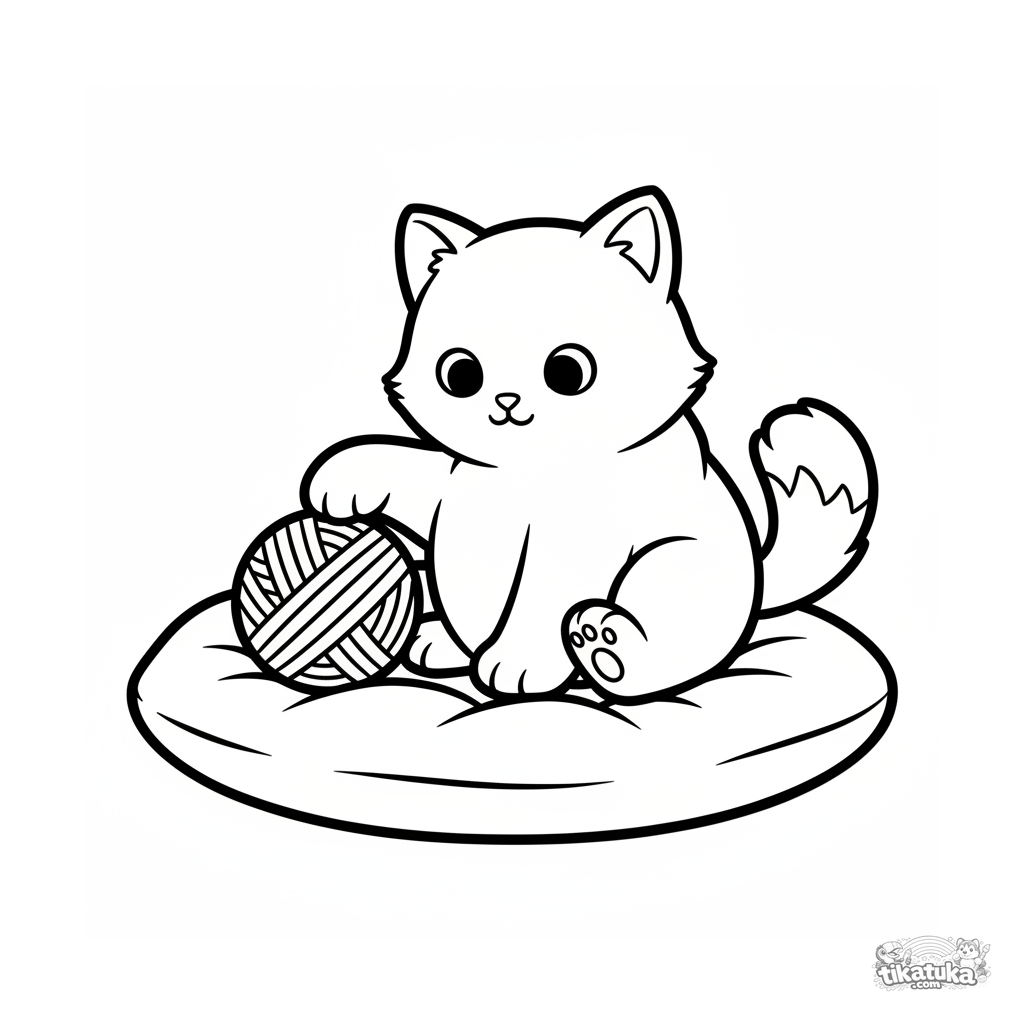 Página para colorear realista para niños pequeños: un gatito juega con un ovillo en un cojín. Contornos simplificados, formas grandes, para 2-3 años.