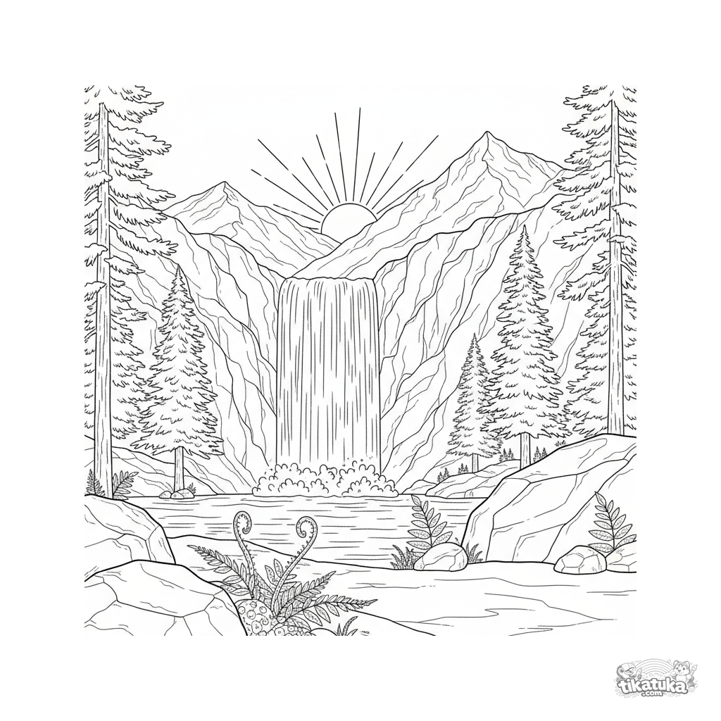 Página para colorear de un paisaje montañoso realista con cascada y pinos. Para niños mayores de 7 a 12 años.