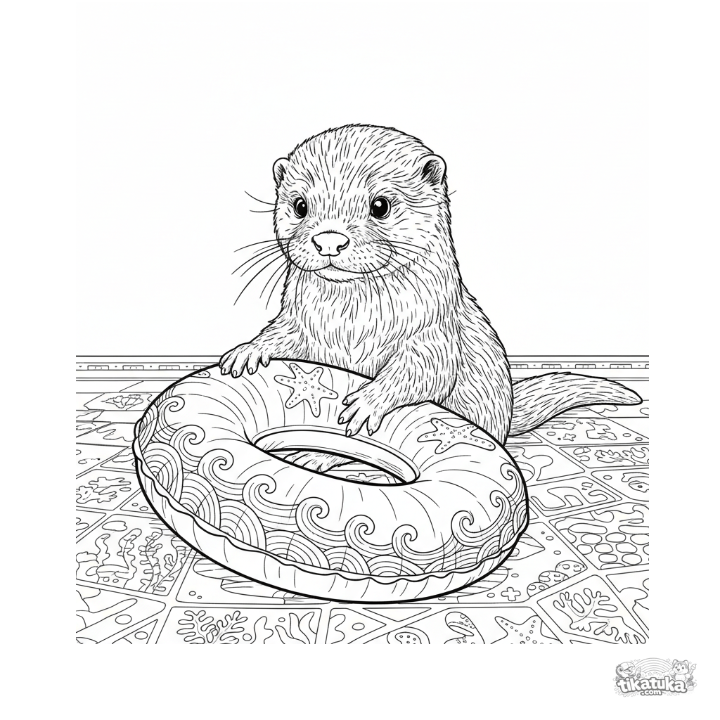 Página para colorear detallada para 10-12 años: un cachorro de nutria realista inspecciona con curiosidad un anillo inflable en el fondo de la piscina. Textura del pelaje, pose expresiva.