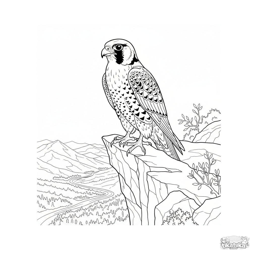 Página para colorear para niños mayores 7-12: un halcón peregrino realista posado en un acantilado rocoso. Alto detalle en plumas y paisaje.