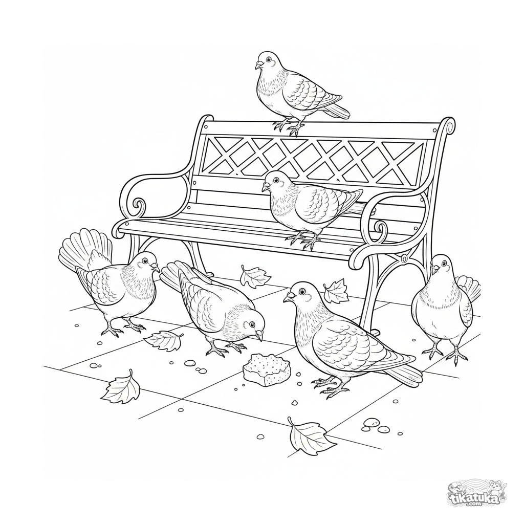 Página realista detallada para colorear para niños de 10-12 años: una bandada de palomas urbanas junto a un banco de hierro en un parque. Estilo de ilustración científica.