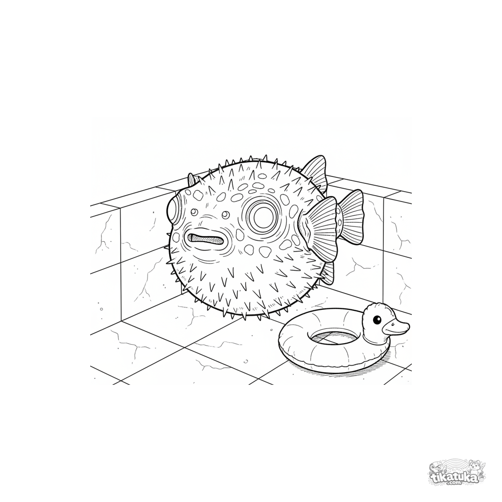 Página intrincada para colorear de un pez globo realista en una esquina de piscina. Para niños mayores de 10 a 12 años.