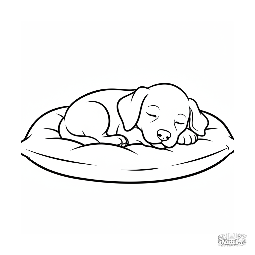 Página para colorear realista pero simple para niños pequeños: un cachorro durmiendo en un cojín. Contornos claros, pocos detalles, para 2-3 años.