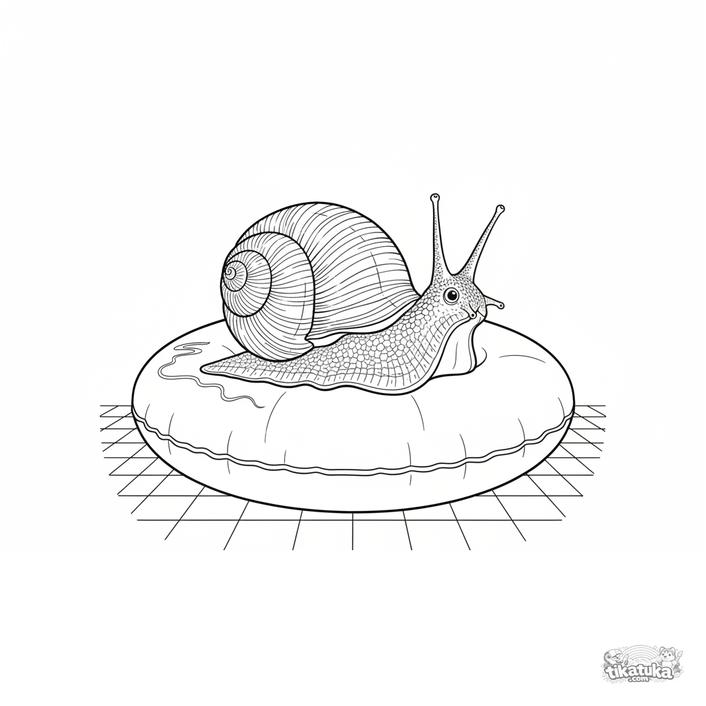 Página compleja para colorear para niños de 10-12 años: un caracol marino se arrastra sobre un flotador. Texturas de concha, precisión anatómica.