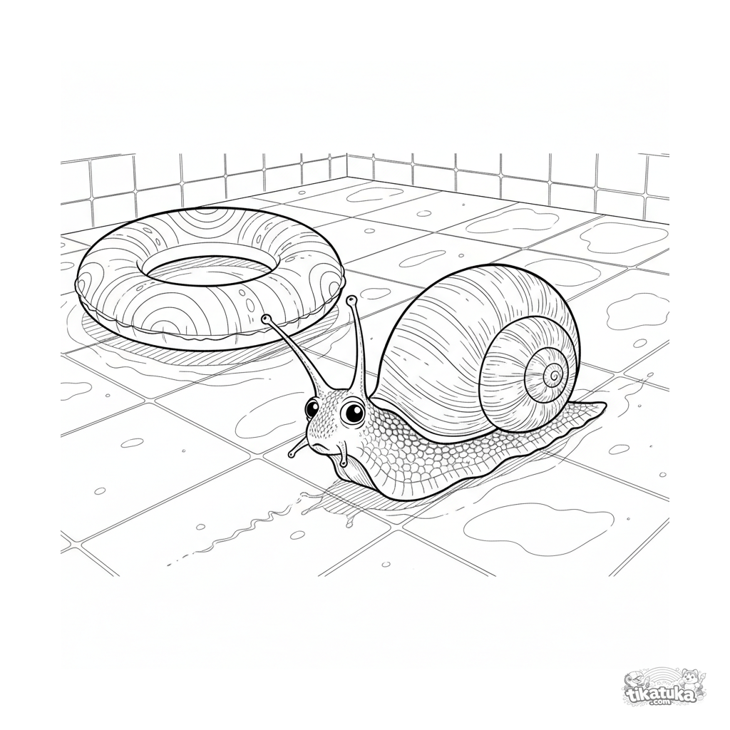 Página para colorear para niños mayores 10-12: un caracol realista se arrastra por el fondo de la piscina. Estilo de grabado vintage, texturas.