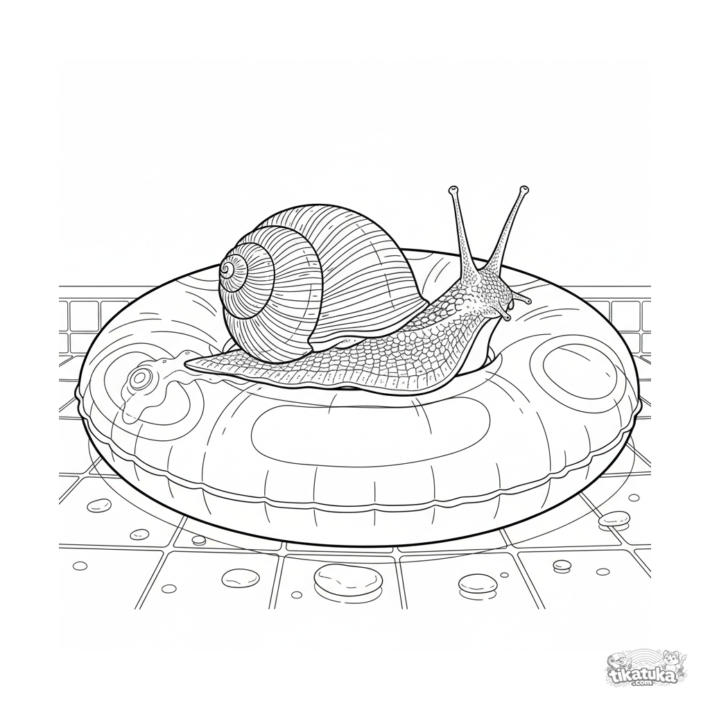 Página detallada para colorear para niños mayores 10-12: un caracol realista con concha en espiral se arrastra por un anillo inflable.