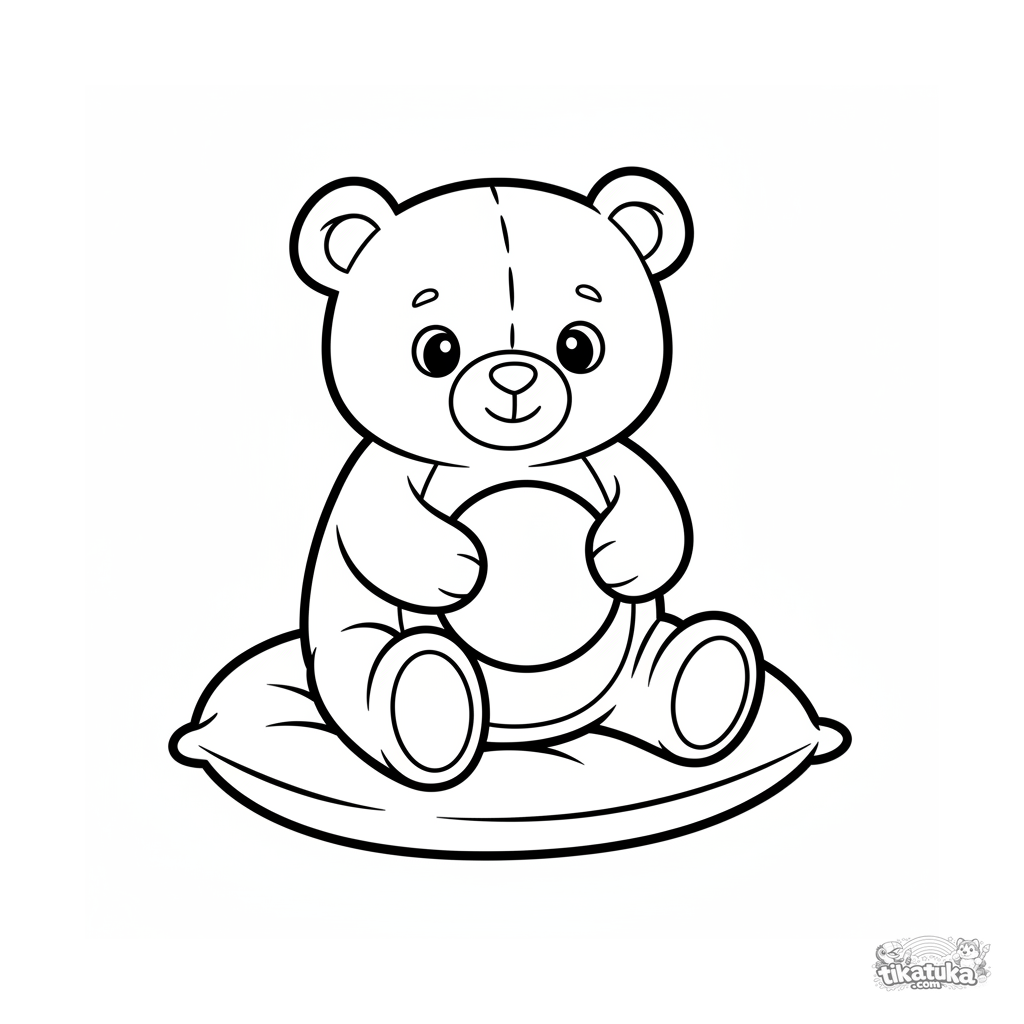 Página para colorear realista para niños pequeños: un oso de peluche sentado en un cojín, sosteniendo una bola lisa. Contornos claros.