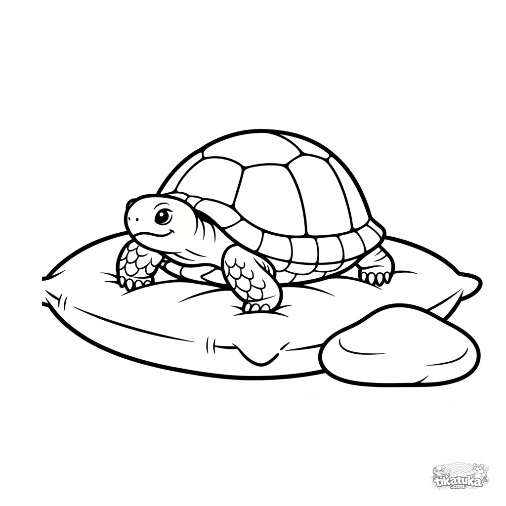 Página para colorear realista pero simple para 2-3 años: una tortuga descansa en un cojín. Formas simplificadas, contorno claro.