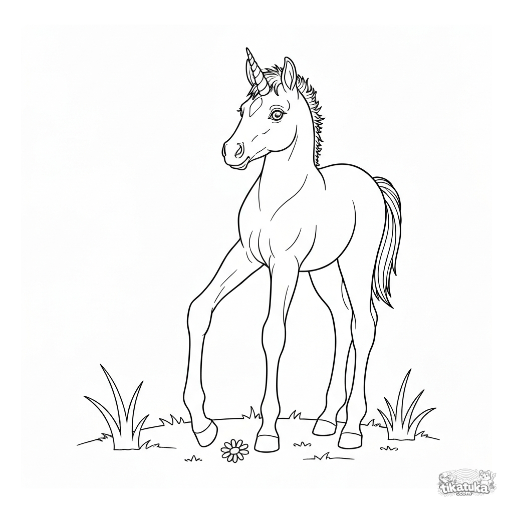 Página para colorear realista para niños: un potro de unicornio con cuerno en espiral está en un prado. Escena simple y tranquila con hierba.