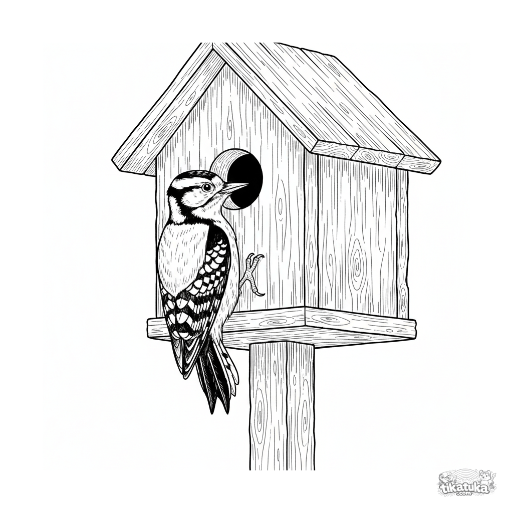 Página para colorear para 10-12 años: un pájaro carpintero realista examina la entrada de una caja nido de madera. Arte lineal detallado, perfecto para amantes de la naturaleza.