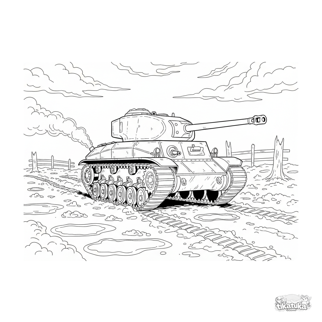Página para colorear de un tanque realista de la Segunda Guerra Mundial en un campo fangoso. Para niños de 7 a 12 años.