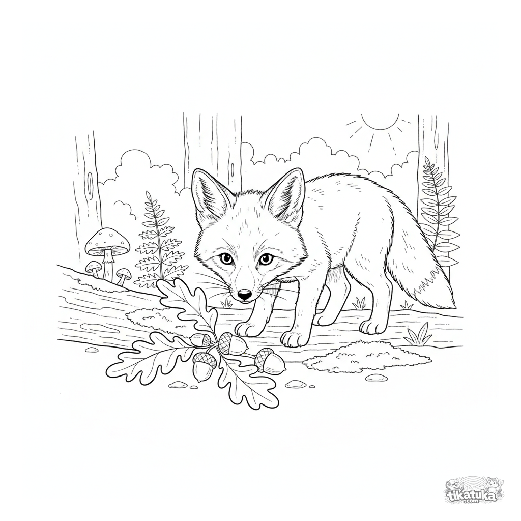 Página para colorear para niños de 4-6 años: un cachorro de zorro curioso explora el suelo del bosque otoñal con bellotas y hojas. Cuerpo completo visible.