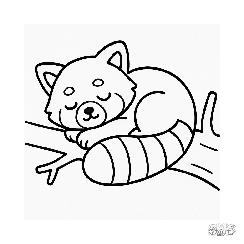 Página para colorear para niños. Un panda rojo esponjoso durmiendo hecho bolita en una rama gruesa, envuelto en su cola peluda. Descarga gratis.