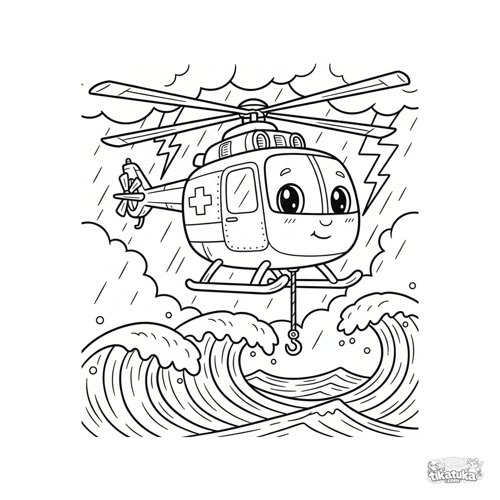 Página para colorear de un helicóptero de rescate para niños de 7-9 años. El helicóptero se cierne sobre olas embravecidas durante una tormenta, listo para rescatar. Escena dinámica.