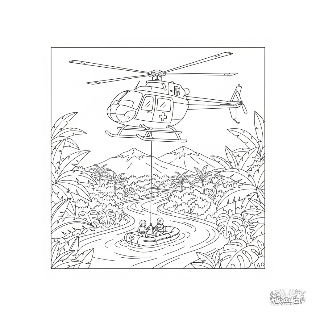 Página para colorear de un helicóptero de rescate sobre un río en la jungla, bajando un cable. Para niños de 4 a 6 años, formas claras.
