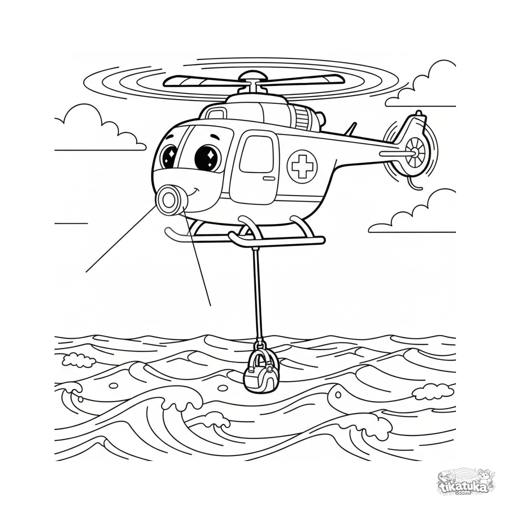 Página para colorear de un helicóptero de rescate sobre el océano. Para niños de 7 a 9 años. Contornos definidos, pose dinámica.
