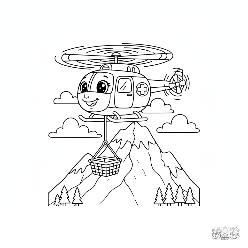 Página para colorear para niños de 4-6 años: un helicóptero de rescate amigable se cierne junto a una montaña nevada. Formas claras y detalles moderados.