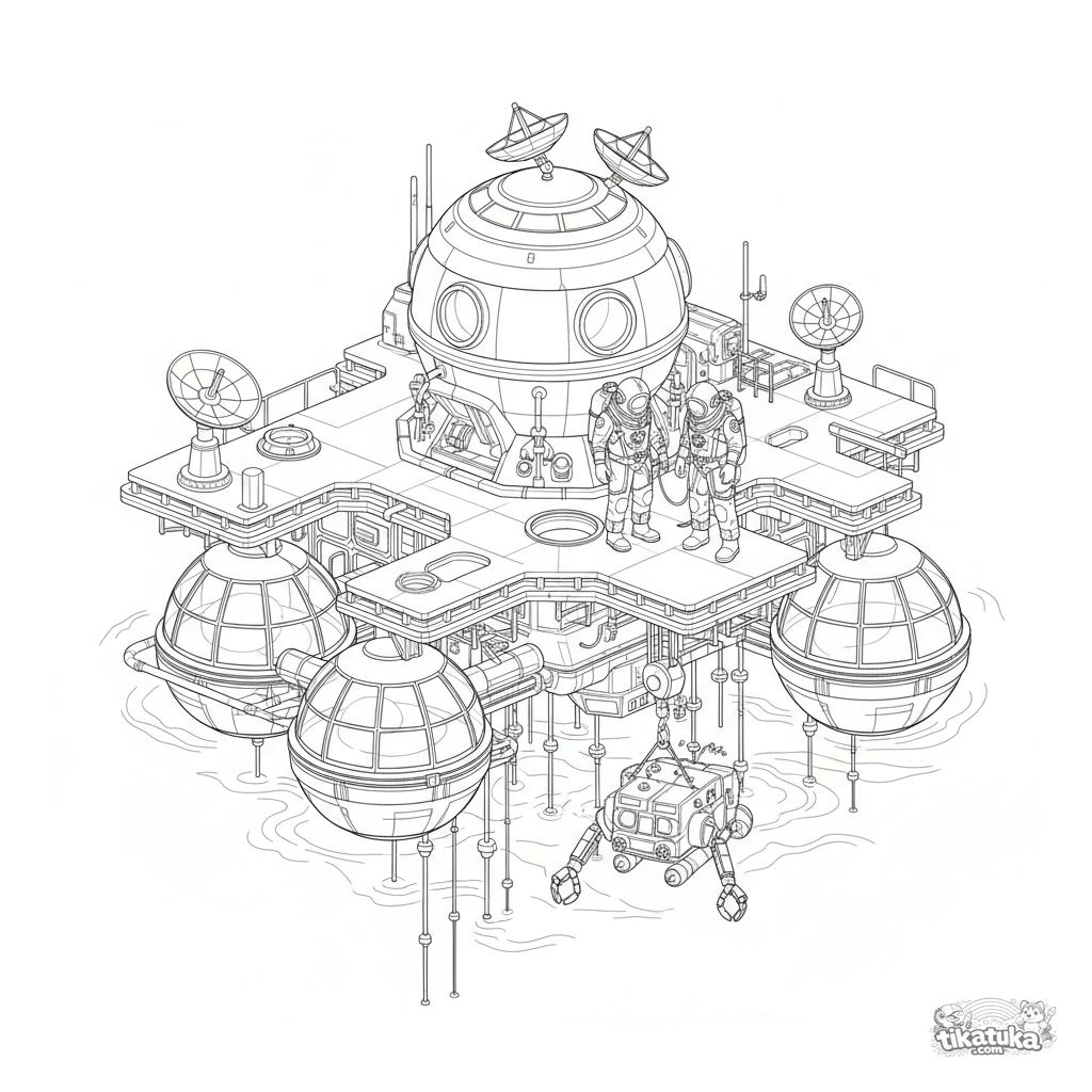 Página para colorear para 10-12 años: una plataforma de hábitat de investigación submarina futurista. Escena detallada con científicos, cúpulas y robot para colorear.