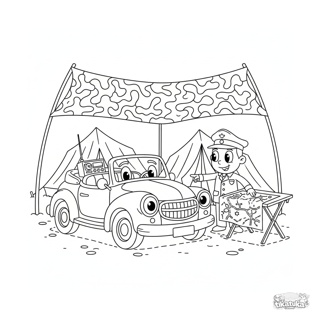 Página para colorear para preadolescentes 7-9: un coche de mando vintage bajo una red de camuflaje cerca de las carpas del cuartel general. Un oficial estudia un mapa en una mesa plegable.