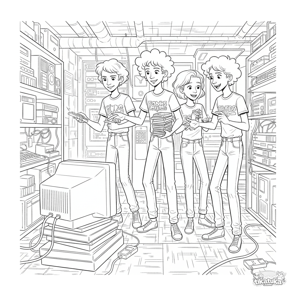 Página para colorear para 10-12 años: reunión de un club de computadoras retro en una sala de servidores. Adolescentes discuten código entre monitores viejos. Escena detallada.