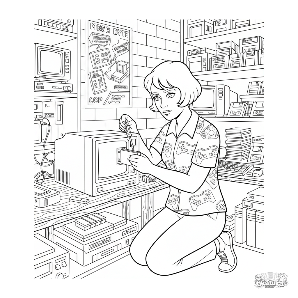 Página para colorear para niños de 10-12 años: un coleccionista de tecnología retro repara una computadora vieja en un taller del sótano. Escena detallada en estilo guía de campo.
