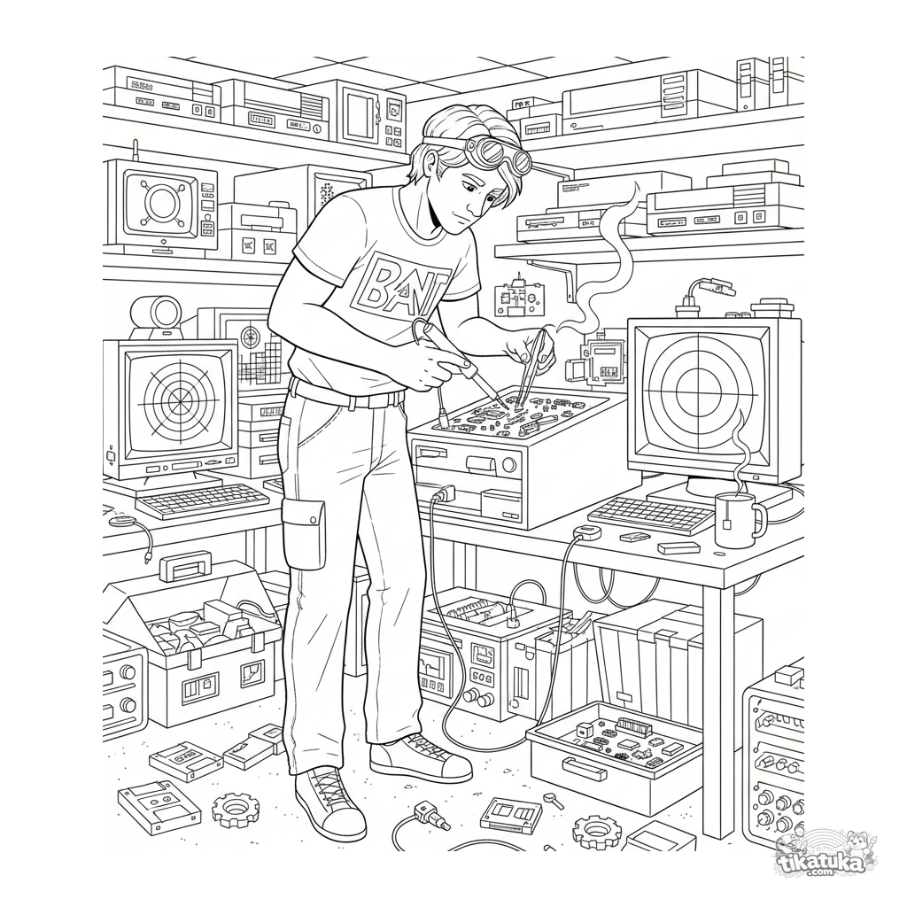 Página para colorear de alto detalle: un coleccionista de tecnología retro suelda una placa en un taller del sótano. Para niños de 10-12 años.