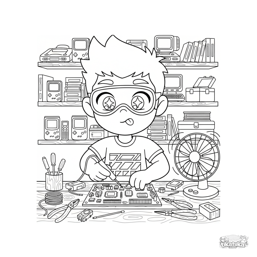 Página para colorear para niños de 10-12 años: un coleccionista de tecnología retro soldando una placa base en un sótano. Detalles: estantes con consolas, herramientas, ventilador.