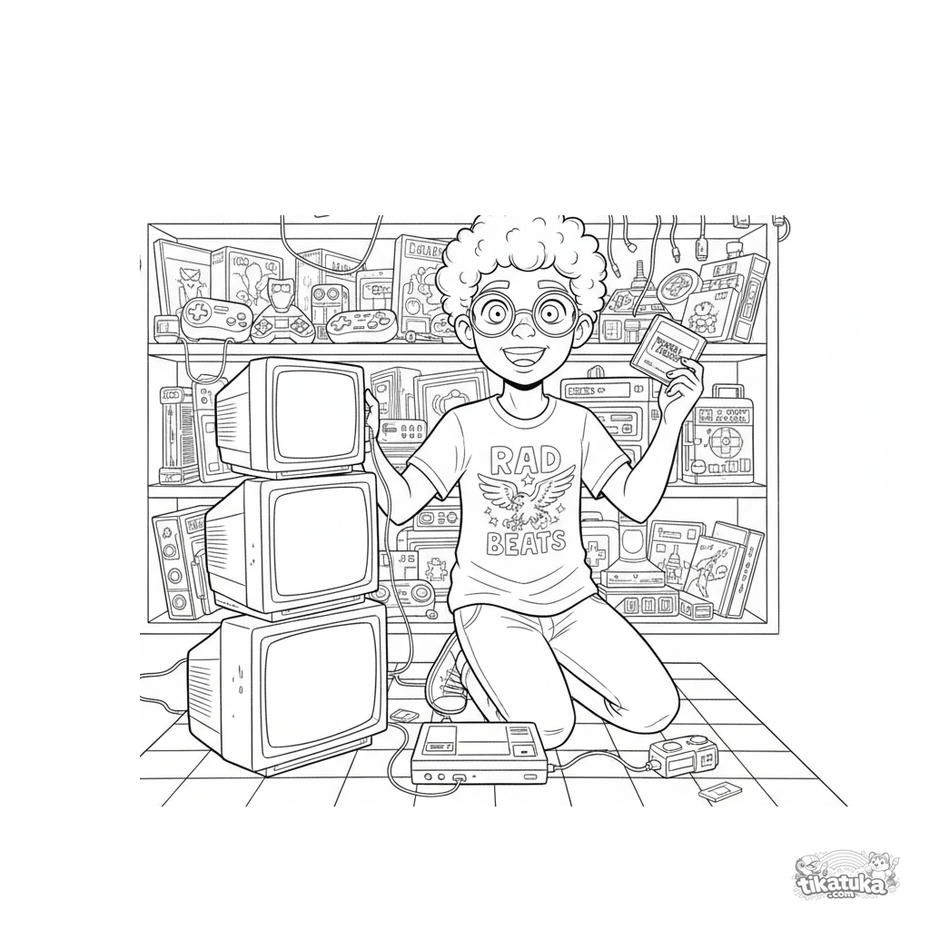 Página para colorear para niños de 10-12 años: un coleccionista de tecnología retro probando consolas viejas en un sótano lleno de monitores, cartuchos y cajas de juegos.