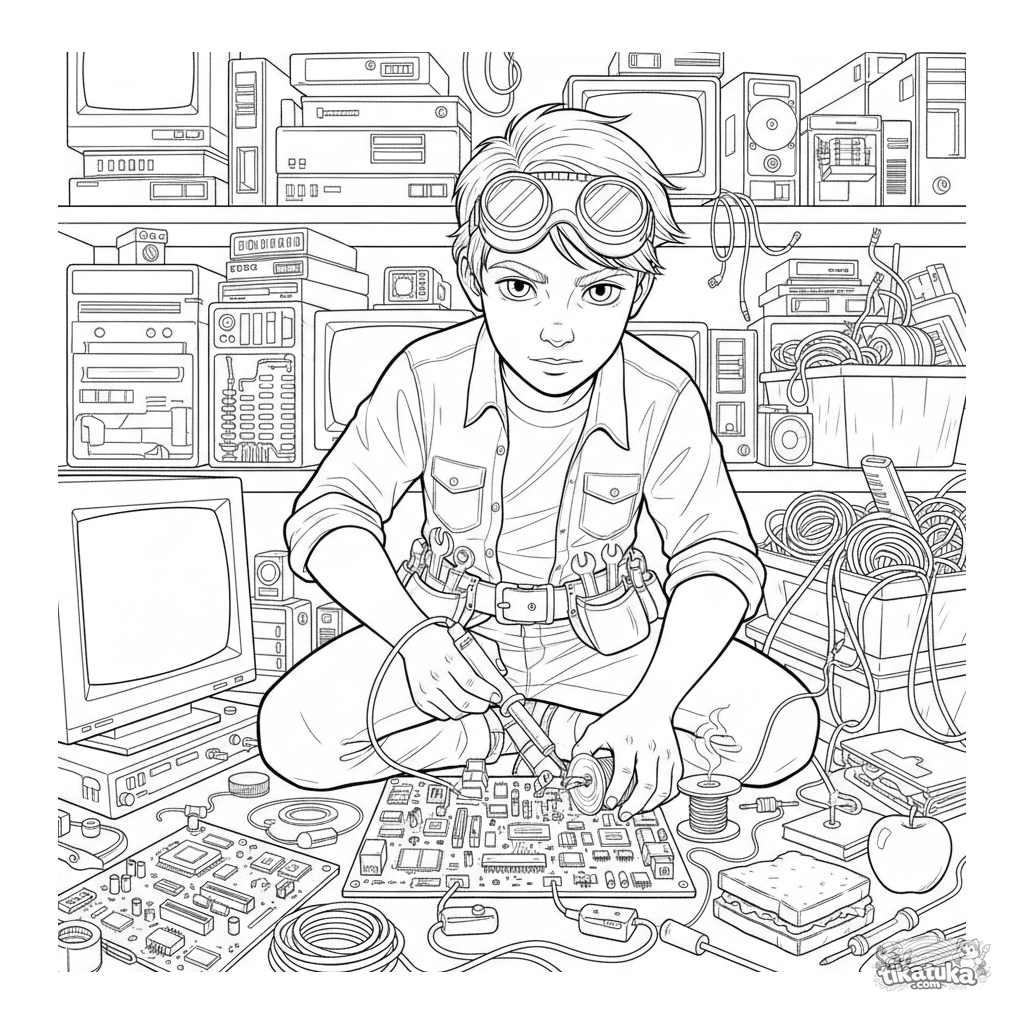 Página para colorear para niños de 10-12 años: un adolescente apasionado por la tecnología retro soldando una placa base en un laboratorio del sótano. Muchos detalles, herramientas y computadoras viejas.