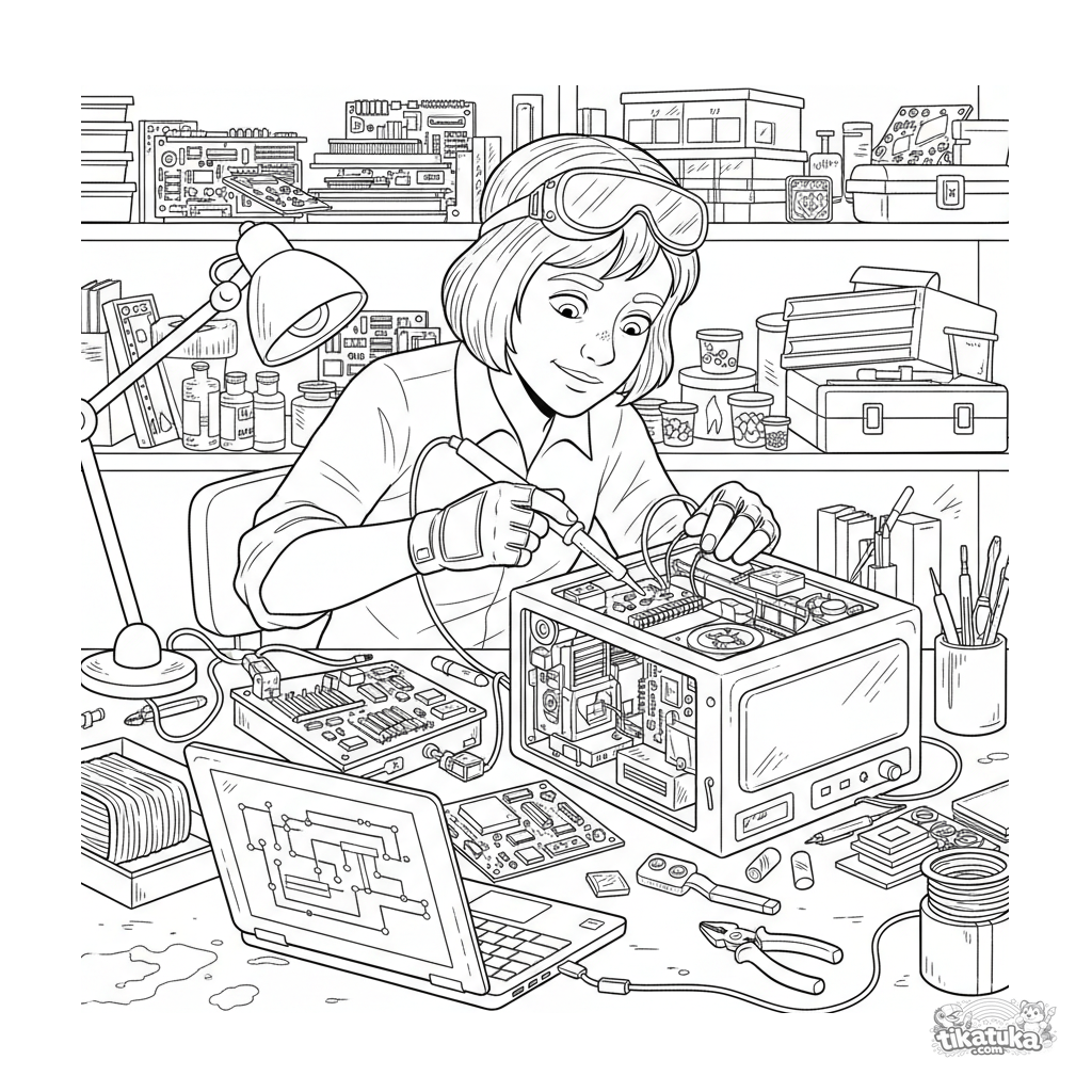 Página para colorear detallada: un modificador de computadoras retro trabajando en un taller del sótano. Muchos elementos: herramientas, esquemas, piezas.