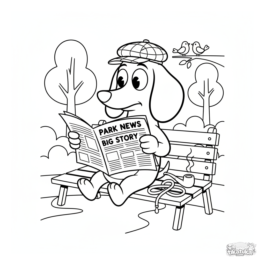 Página para colorear para niños de 7-9 años en estilo retro: un perro salchicha con gorra lee el periódico en un banco del parque.