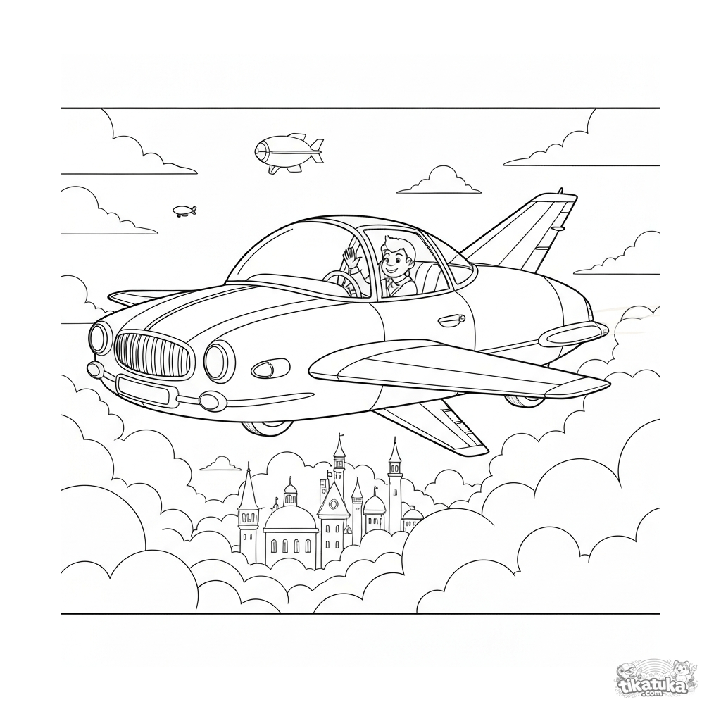 Página para colorear intrincada de un coche volador retro detallado volando sobre una ciudad en las nubes. Para mayores de 8 años.
