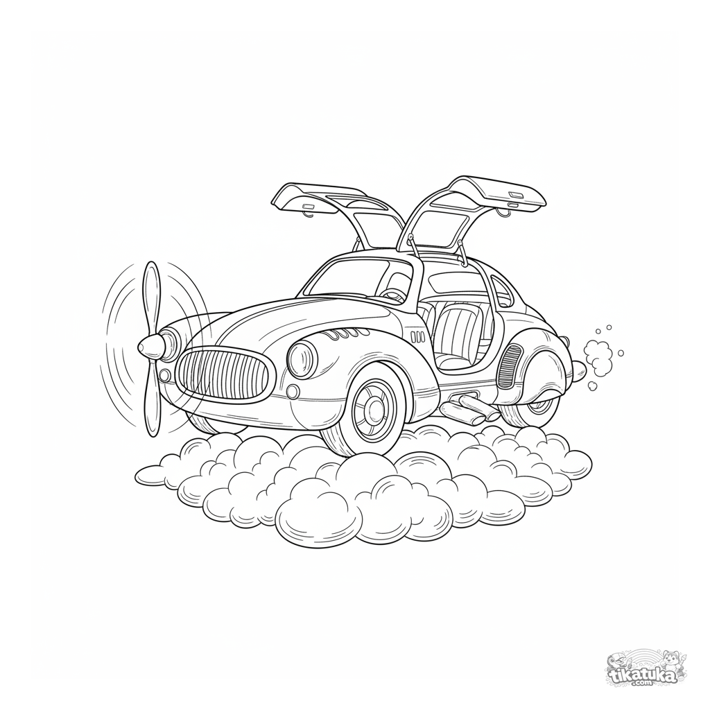 Página detallada para colorear de un coche volador retro flotando sobre nubes. Para niños de 6 a 9 años. Diseño realista.