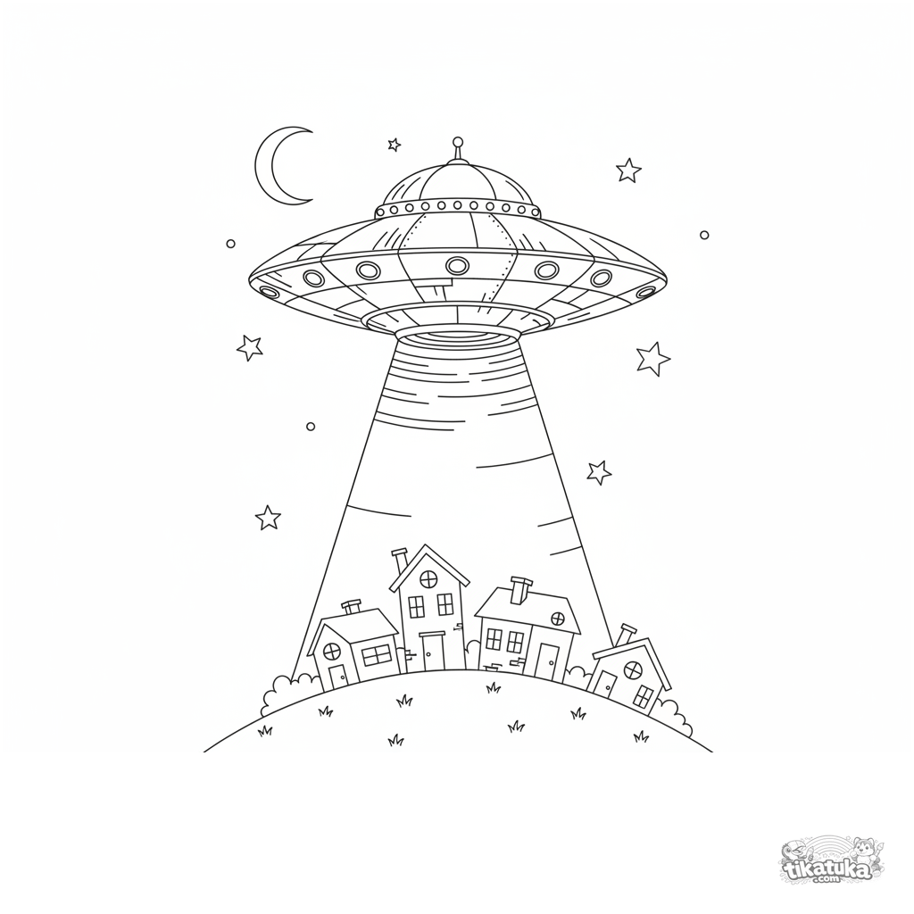 Página para colorear difícil para niños 8-12: un platillo volador retro se cierne sobre un pueblo dormido por la noche. Alto detalle, estilo realista.