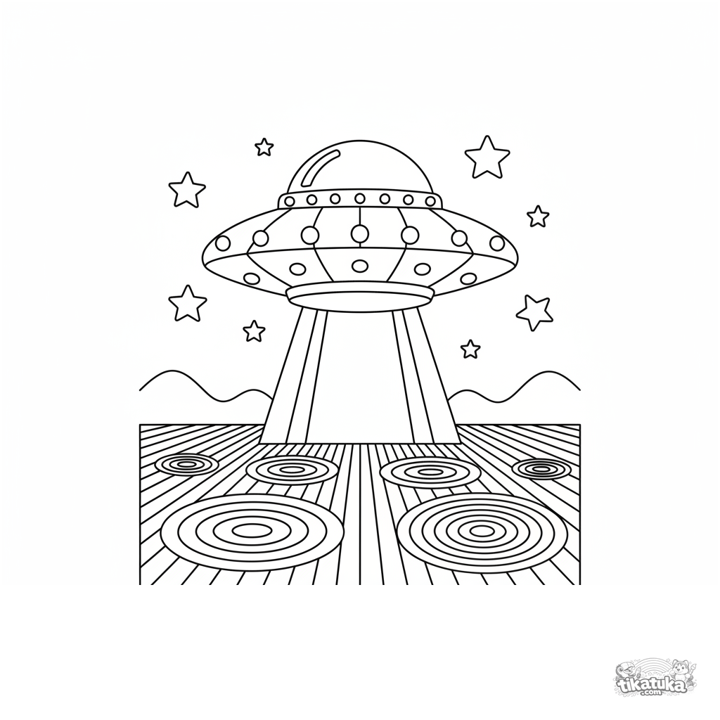 Página para colorear para niños de 4-6 años: un platillo volador retro se cierne sobre misteriosos círculos de cultivo en un campo.