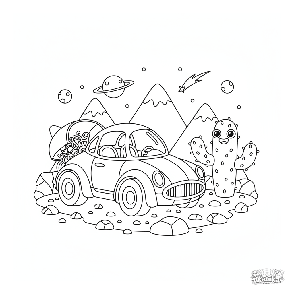 Página para colorear para niños 4-6: un coche cohete retro-futurista aparcado en un paisaje marciano.