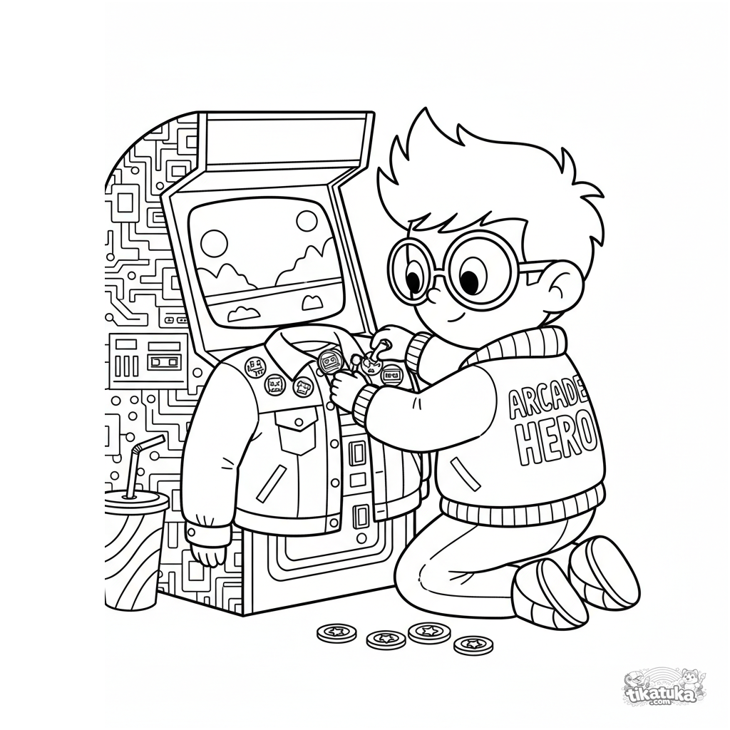 Página para colorear para niños de 7 a 12 años: un jugador retro en una sala de arcade organizando una colección de pines de esmalte. Escena detallada con máquinas de juego y accesorios.