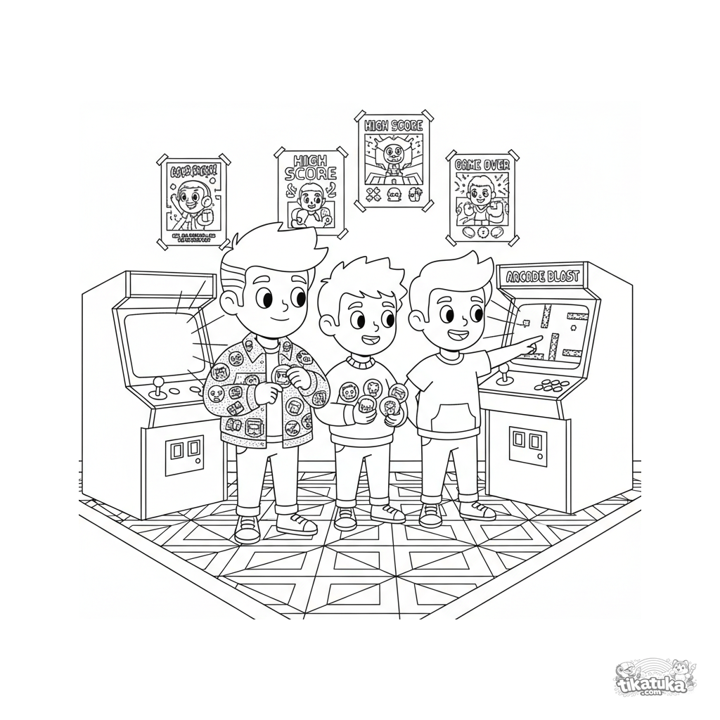 Página para colorear para niños de 7-12 años: un trío de gamers retro coleccionando pines en una sala de arcade. Escena detallada con máquinas, carteles y alfombra.
