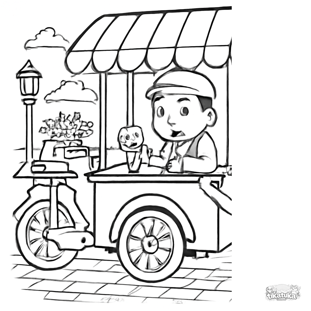 Página para colorear de un triciclo retro de helados para niños de 5-8 años. Un carrito vintage en una plaza con un niño esperando.