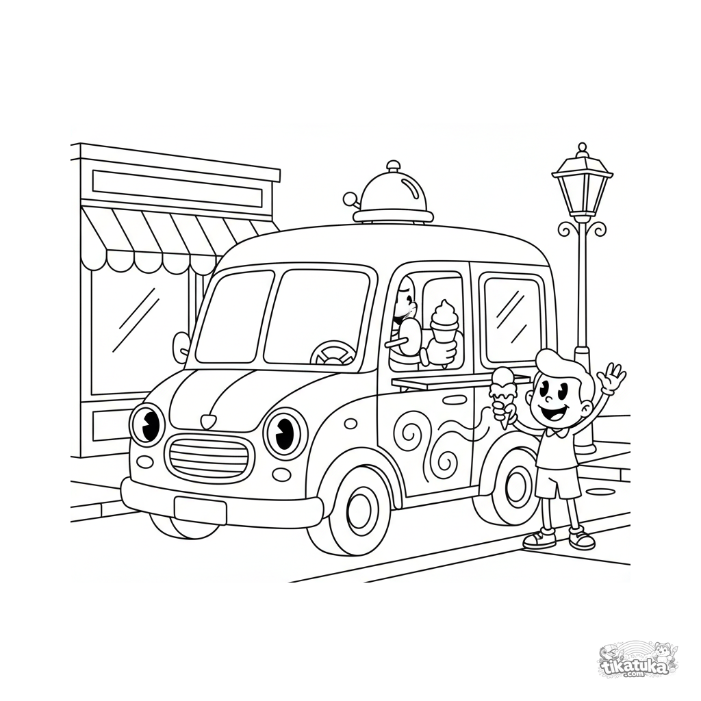 Página para colorear para niños de 4-6 años: un camión de helados retro en una calle de la ciudad. El vehículo alegre sirve golosinas. Formas simples y contornos claros son perfectos para colorear.
