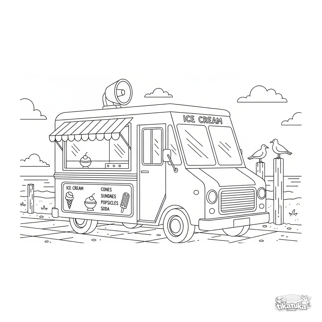 Página para colorear para niños con un camión de helados retro en un paseo marítimo soleado. Escena detallada pero clara para niños de 4 a 6 años.