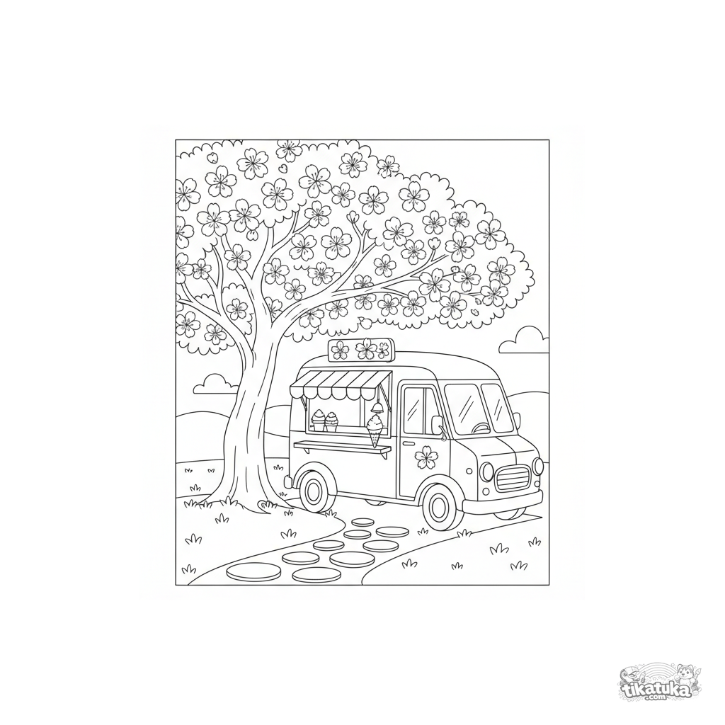 Página para colorear de un camión de helados retro estacionado bajo un cerezo en flor. Para niños de 4 a 6 años.