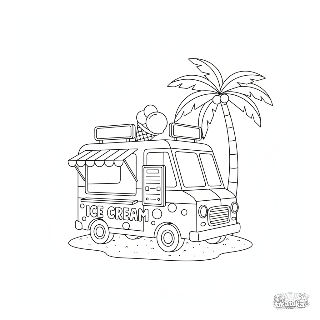 Página para colorear para niños: un camión de helados retro de los años 50 estacionado bajo una palmera. Contorno realista del vehículo, para 4-6 años.