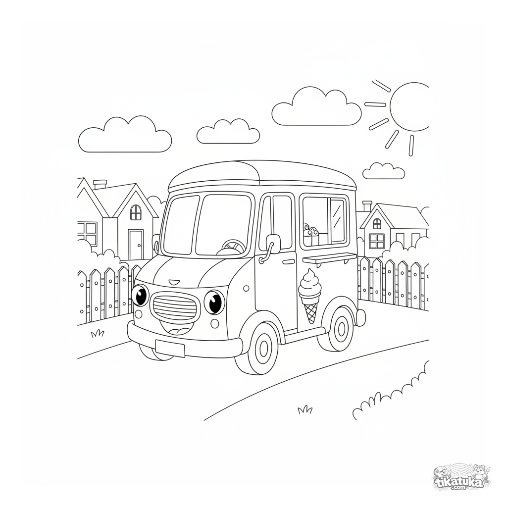 Página para colorear de un camión de helados retro alegre conduciendo por una calle soleada. Para niños de 4 a 6 años. El camión tiene una parrilla sonriente.