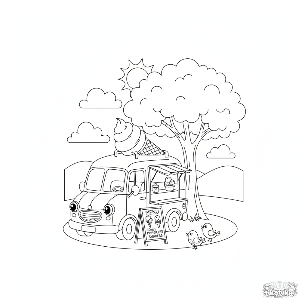 Página para colorear para niños: un camión de helados retro y feliz en un parque. Para niños de 4-6 años. El camión tiene cara sonriente, un cono en el techo y ventana abierta.