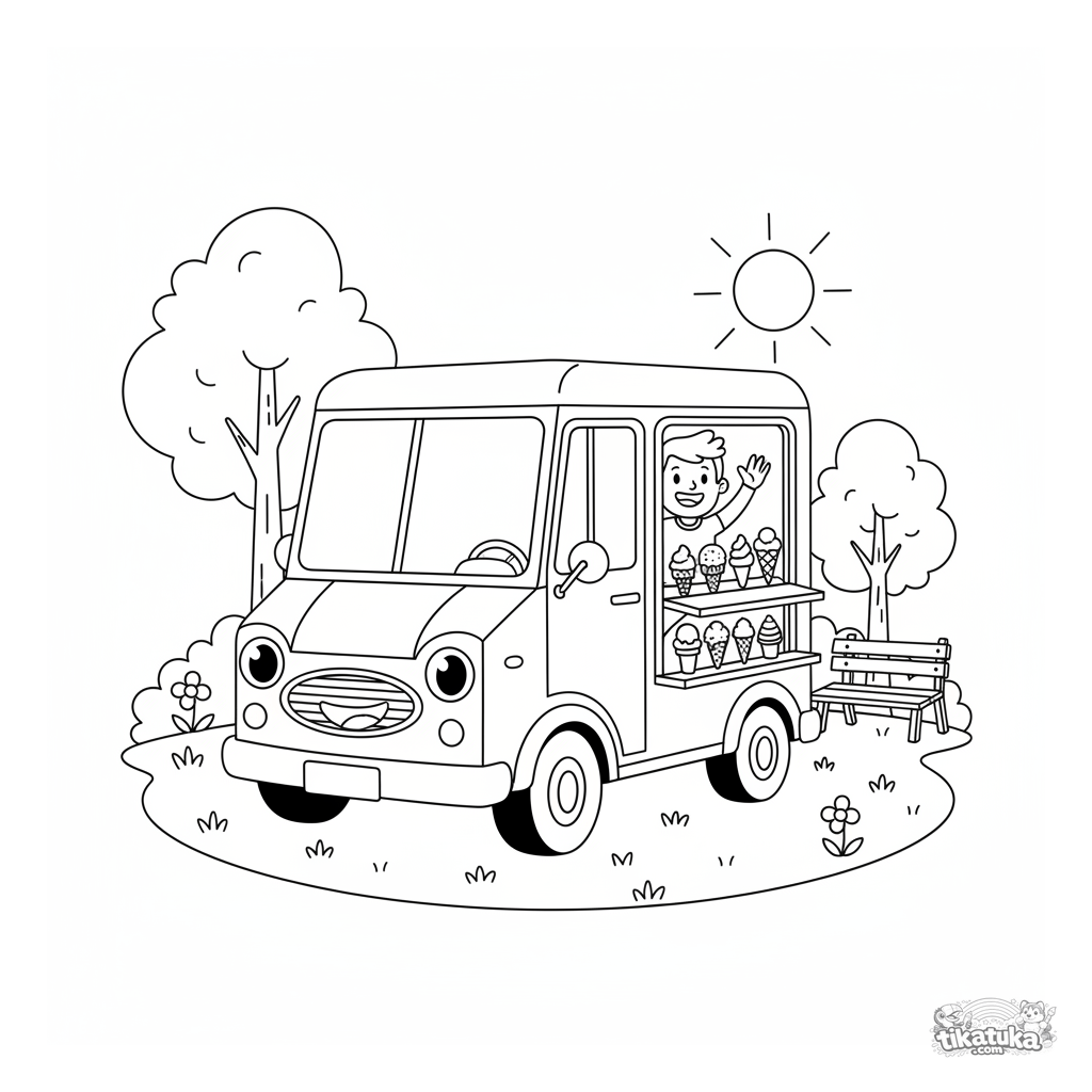Página para colorear para niños de 4-6 años: un camión de helados retro con cara sonriente está en el parque. Escena de vehículo brillante y simple.