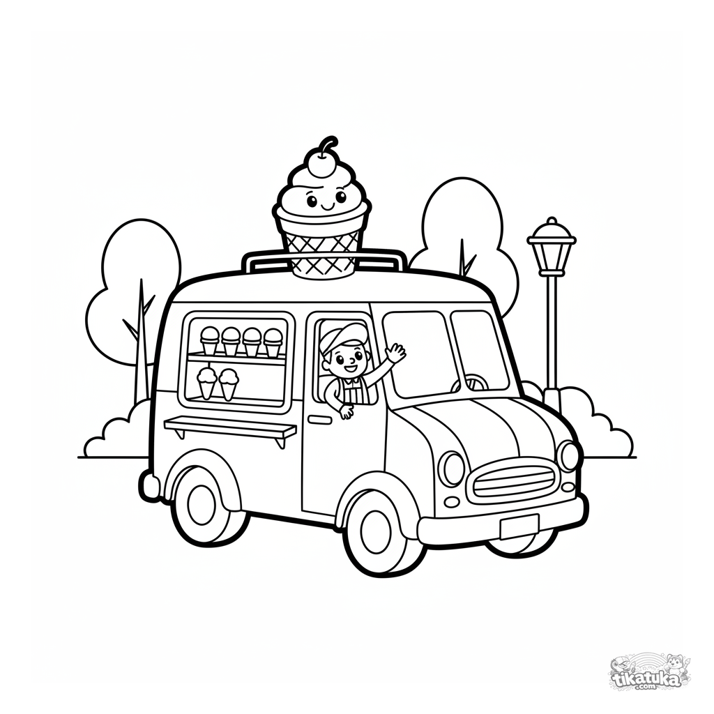 Página para colorear fácil para niños pequeños de 2-3 años. Un alegre camión de helados retro con un sundae gigante sonriente en el techo.