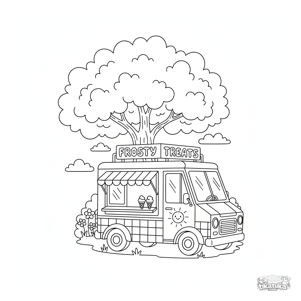 Página para colorear para niños de 4-6 años: un camión de helados vintage con patrón de ajedrez estacionado bajo un gran árbol. Contornos claros y detalles reconocibles.