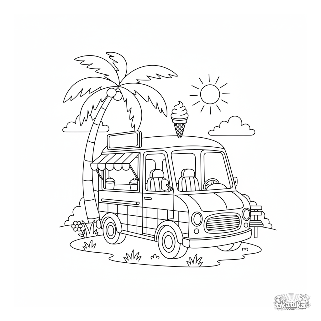Página para colorear para niños 4-6: un camión de helados retro a cuadros estacionado bajo una palmera. Estilo realista, detalles reconocibles, dificultad moderada.